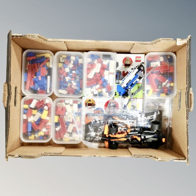 A box of Lego and Lego books
