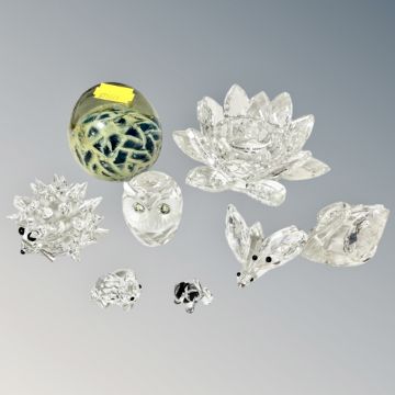 A collection of six miniature crystal animal ornaments, Swarovski, tea light holder and Mdina glass paperweight