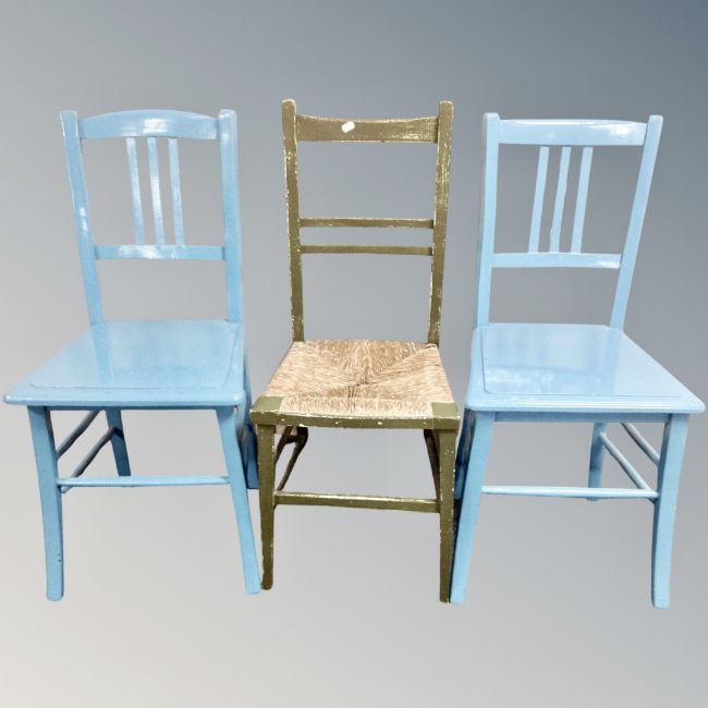 A pair of Edwardian painted bedroom chairs together with a further rush seated painted chair