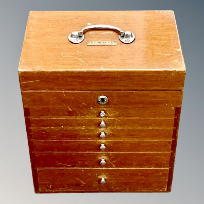 A mid 20th century portable dentist's chest, fitted with six drawers and rising top section, width 33 cm.
