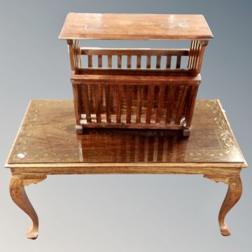 A Chinese hardwood brass inlaid coffee table with plate glass top and similar magazine rack