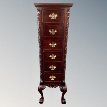 An Eastern narrow six drawer chest on claw and ball feet with brass dropped handles