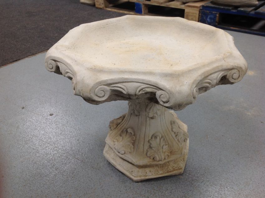 A concrete octagonal bird bath