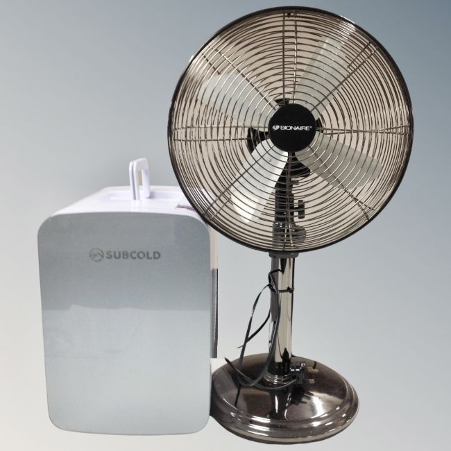 A Bionaire desk fan together with a subcold mini fridge