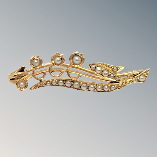 A gold seed pearl bar brooch CONDITION REPORT: Apparently unmarked. 2.7g