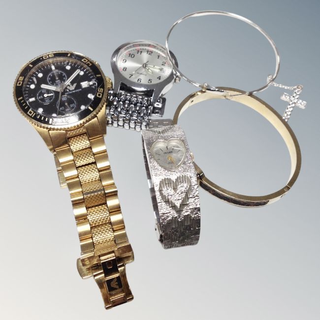 A bag containing Gent's Emporio Armani watch, lady's Gillex 17 jewel watch, nurse watch, two bangles (5)