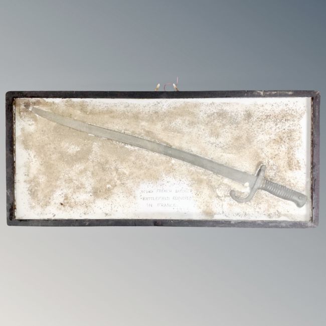 A French 1886 Chassepot bayonet, recovered from a WWI battlefield in 1993, framed.