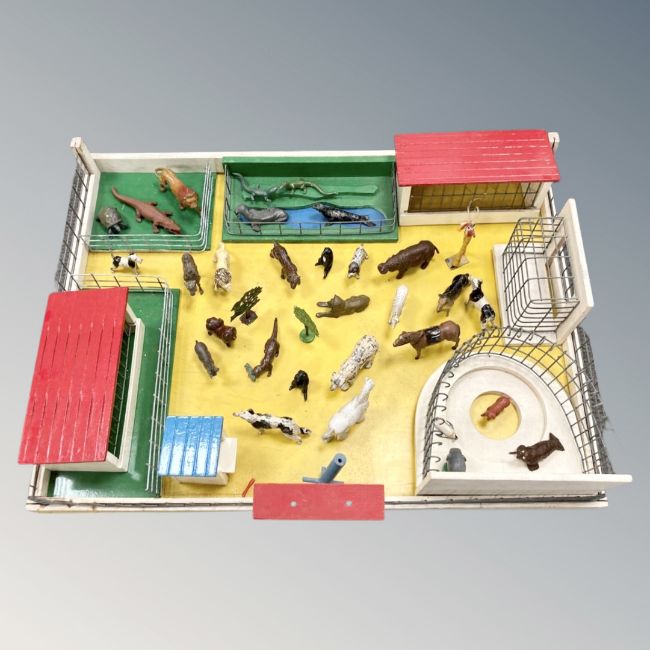 A mid 20th century ply model zoo, together with a quantity of farm and zoo animals in lead and plastic, small Mimic clock-work car and a quantity of doll's house items including furniture, accessories, ceramic bath, ceramic stoves etc. (Q)