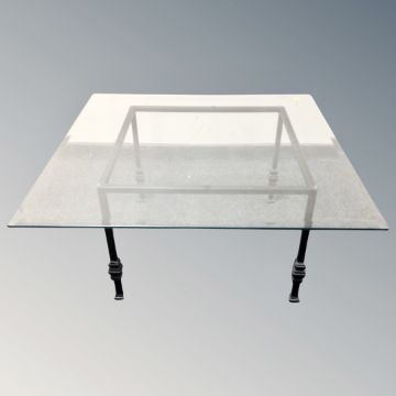 A contemporary square glass topped coffee table on metal base