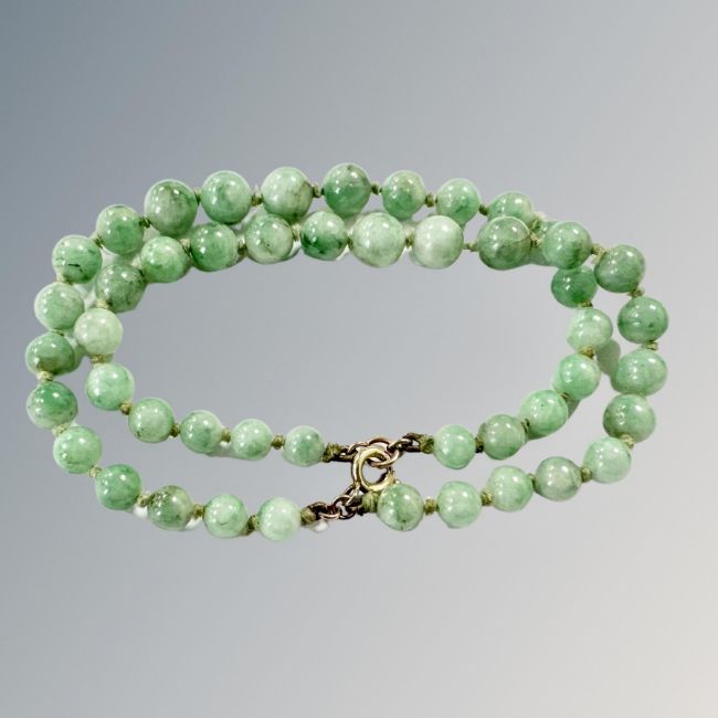 A double strand jade bracelet with gold clasp.