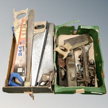 Two boxes of vintage hand saws and wood working planes
