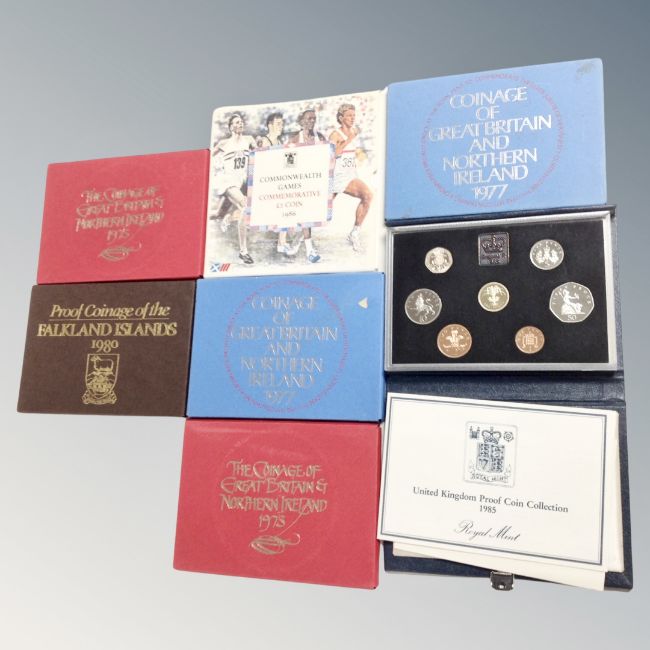 Six coins of Great Britain proof coin sets, 1973 x 2, 1977 x 2, 1980 and 1985 together with a Commonwealth Games commemorative £2 coin 1986 pack.