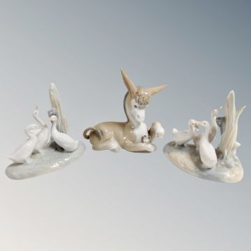 A Lladro figure of a Donkey with flower together with two Nao duck groups