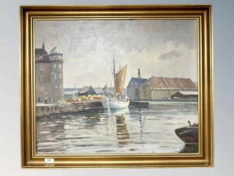 Continental school : Boats in a dock, oil on canvas, 68cm by 56cm