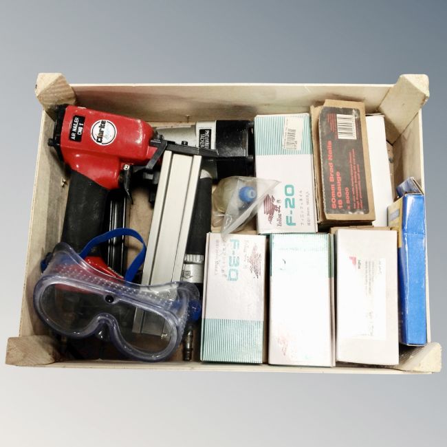A crate containing a Clarke air nail gun together with a further nail gun, boxes of nails and goggles