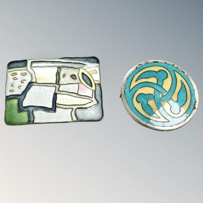 A Norwegian silver and enamel brooch by David Andersen, length 43mm, together with a further Celtic style circular silver and enamel brooch. (2)