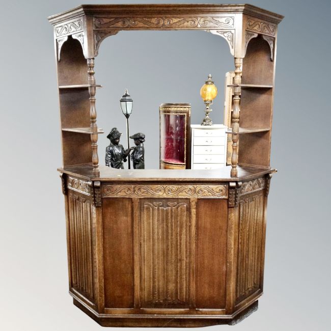 A carved oak linen fold cocktail bar