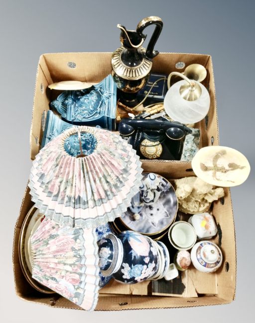 Two boxes of assorted ceramics, table lamps with shades, cabinet plates, ornaments, wall pockets etc