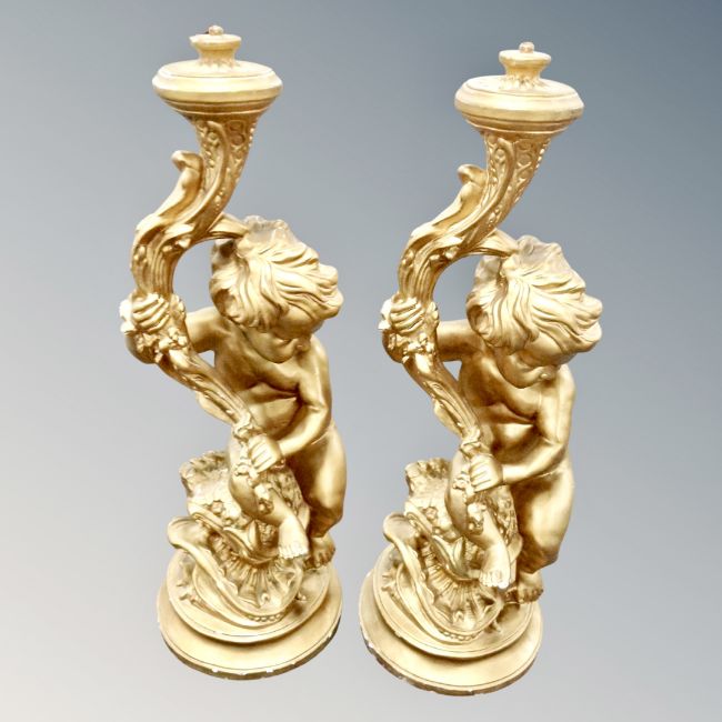A pair of chalk gilt cherub lamp bases, height 73 cm