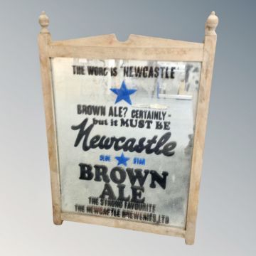 An antique pine framed mirror depicting Newcastle Brown Advertising, 39 cm x 49 cm