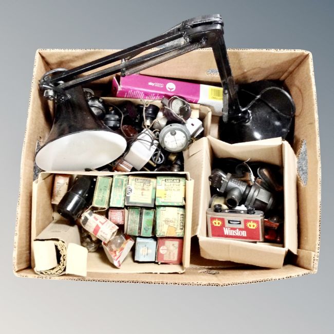 A 20th century black metal anglepoise lamp together with vintage bulbs, meters, bakelite sockets etc