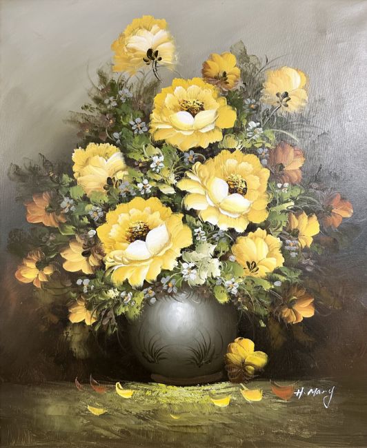 A contemporary oil on canvas still life of flowers in a vase, 60 cm x 50 cm.
