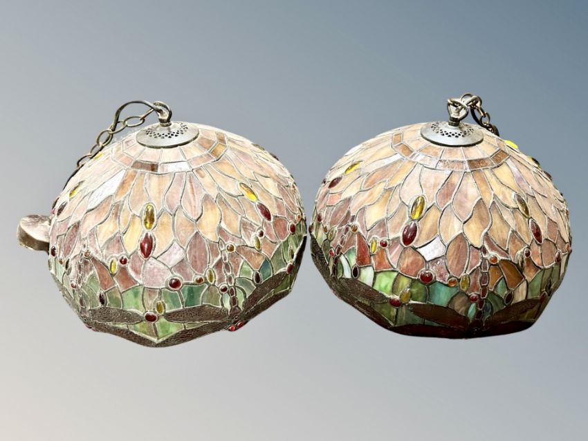 A pair of Tiffany style leaded glass pendant ceiling light shades decorated with dragonflies, diameter 41 cm.