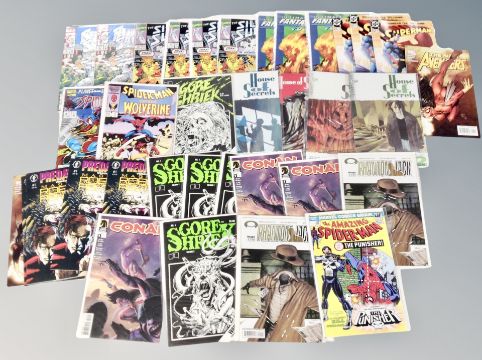 42 modern comics to include DC Superman issue 204 (X3), The New Avengers issue 4 (X2), Conan issue 3 (X3), Ultimate Fantastic Four issue 1 (X6), The Amazing Spider-Man Planet of the Symbiotes issue 1 parts 1 and 2, Silver Sable and the Wild Pack issue 1 (X2), Silver Surfer issue 52 (X4), Predator vs. Magnvs Robot Fighter issue 1 of 2 (X5), Phantom Jack issue 1 (X4), Spider-Man vs. Wolverine issue 1, House of Secrets issues 1, 2, 3 and 13, Gore Shriek issue 1 part one (X1) and part 2 (X4), Marvel The Amazing Spider-Man issue 129 (reissue).
