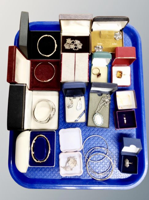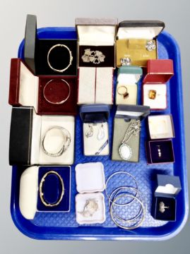 A tray of costume jewellery, rolled gold bangle, silver and dress rings, watch, bracelets etc