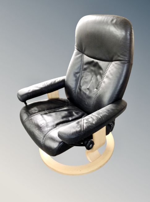 A Norwegian black leather upholstered swivel armchair