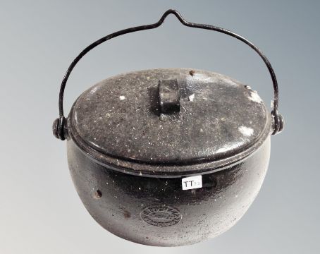 A large cast iron enameled swing handled pot, overall height 38 cm.