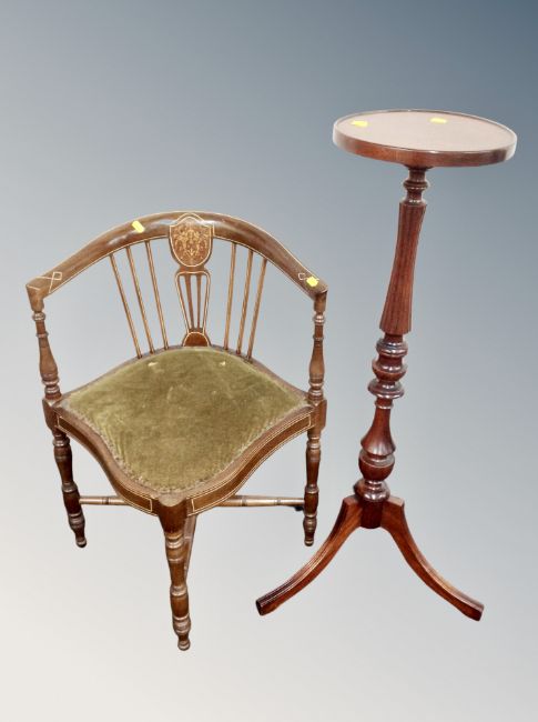 A reproduction mahogany torchere and Edwardian inlaid corner chair