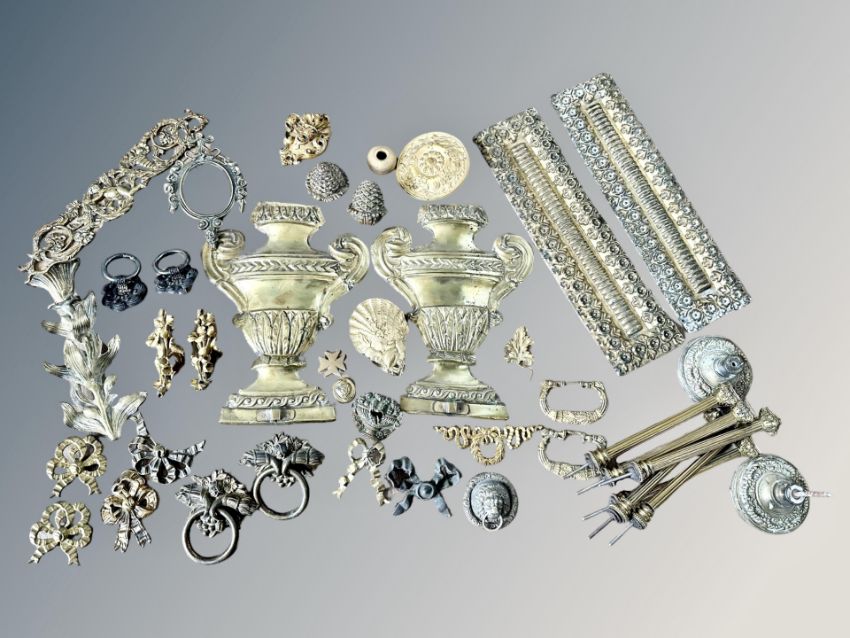 A group of 19th century bronze and brass castings and fixtures, drawer handles, roundels, decorative mouldings etc