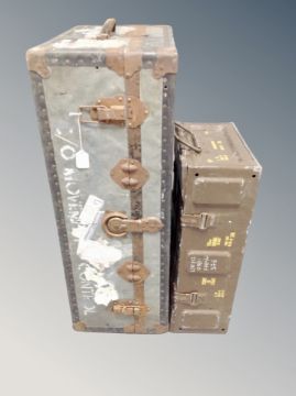 A vintage metal bound shipping trunk and an ammunition crate