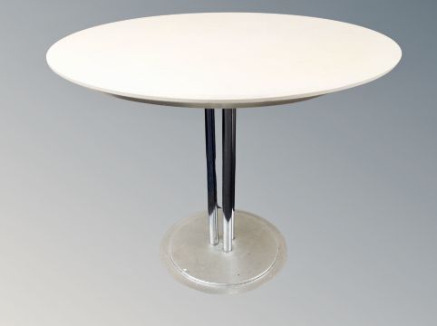 A circular melamine topped kitchen table diameter 90 cm
