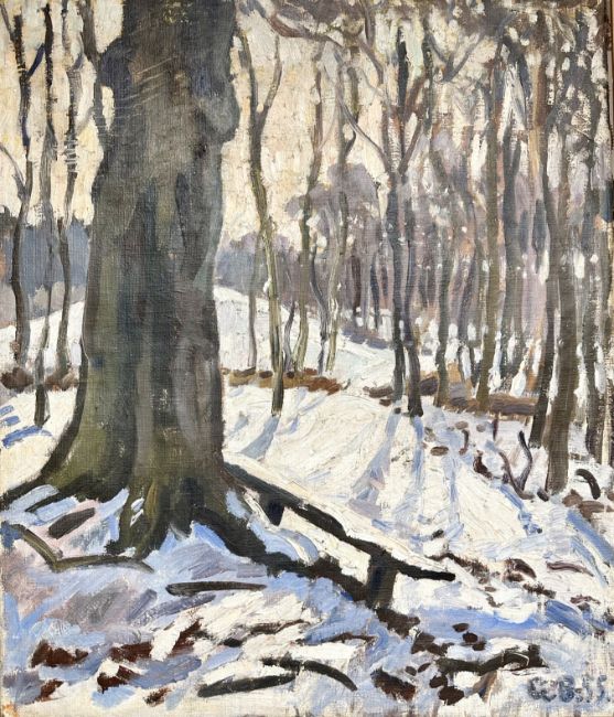 Continental School : Winter woodland, oil on canvas, 69 cm x 59 cm, initialled GB dated '55