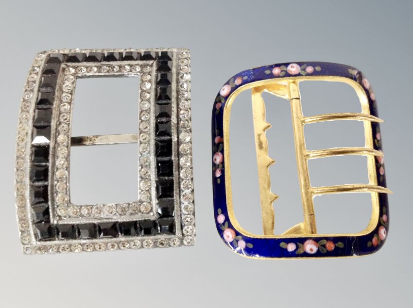A yellow metal buckle with floral and blue enamel decoration, plus on other