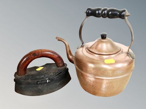 A cast iron smoothing iron together with a copper kettle