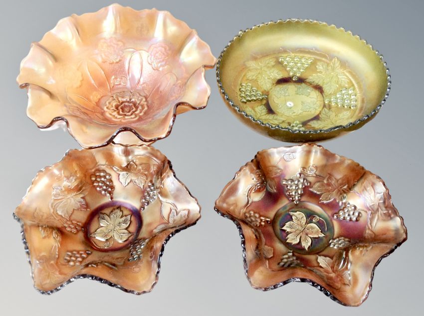 Four pieces of Carnival glass, antique green Fenton grape and cable footed dish, Fenton ruffled grape bowls and Dugan bowl.