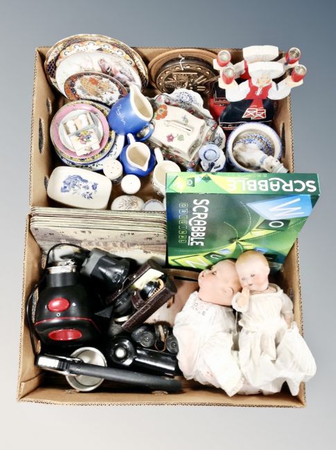 Two boxes containing assorted ceramics, binoculars, place mats, scrabble game, two vintage dolls.