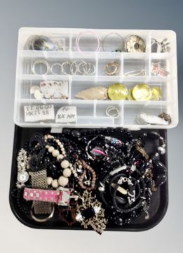 A box containing assorted costume jewelry, bead necklaces and earnings etc.