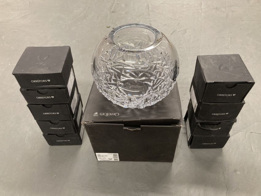 An Orrefors Swedish Crystal vase, in retail box, together with nine further small crystal dishes by the same manufacturer