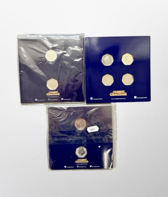Change Checker : 2016 United Kingdom Beatrix Potter 50p Coin Collecting Pack (6 coins), together with a 2018 United Kingdom Paddington 50p Coin Collecting pack (2 Coins) and a 2019 United Kingdom Paddington 50p Coin Collecting pack (2 Coins). (3)