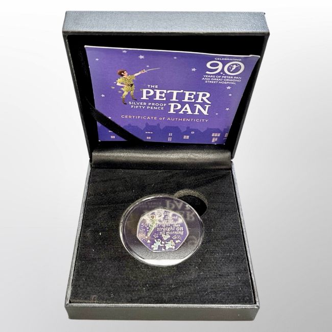Great Ormond Street Hospital : Celebrating 90 Years of Peter Pan - Second to the Right and then Straight On till Morning, 2019 Isle of Man 50p Silver Proof Coin, with papers, boxed.