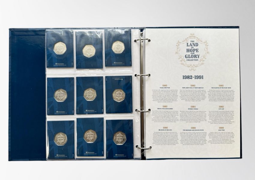 Westminster : The Land of Hope and Glory Collection and Lond To Reign Over Us Collection - Seventy one medals in all, in the shape of 50p coins, not legal tender, in ring-bound folder.