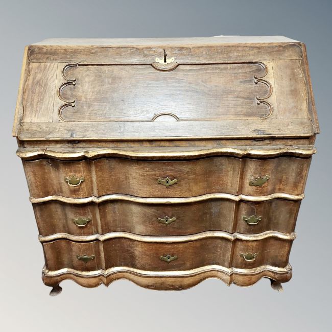 A 19th century continental oak and parcel gilt serpentine fronted bureau, width 115 cm