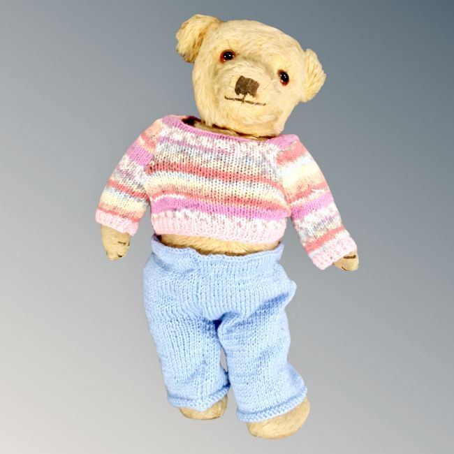 A vintage jointed teddy bear and a boxed set of four miniature plated goblets