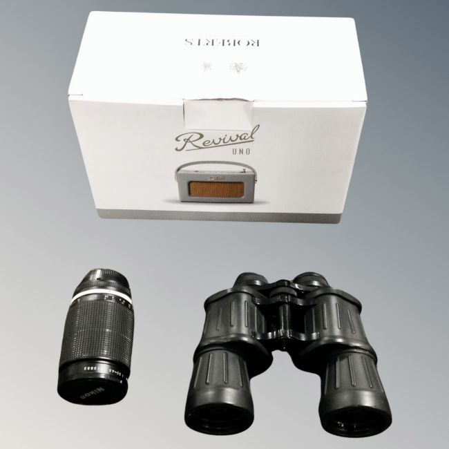 A boxed Roberts vintage style radio, pair of Miranda 7 x 50 binoculars and Nikon 35-135mm zoom lens