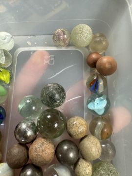 A tray of vintage die cast cars, glass marbles, tin plate wind up circus wagon, wind up monkey with brass cymbals etc