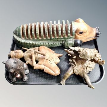 Tray of two carved wooden figures, cast cherub figures, seated bear ornament